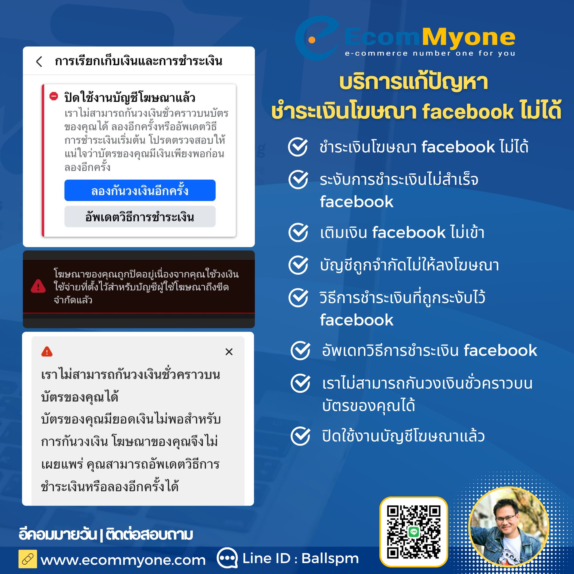 แก้ปัญหาเติมเงิน Facebook ไม่เข้า ระบบตัดเงินล้มเหลว บัญชีโฆษณาหยุดทำงาน Ecommyone ดูแลครบ จัดการให้ยิงแอดได้ต่อเนื่อง